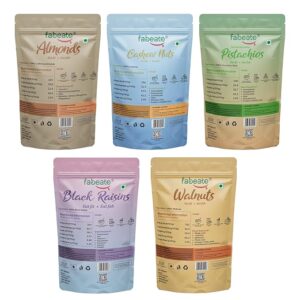 Fabeato Dry Fruits & Nuts Combo (200g x 5) Almonds,Cashews,Pistachios,Walnut Kernels,Seedless Black Raisins