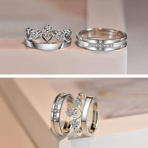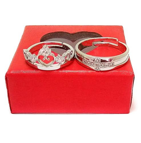 CIYA PLUS Adjustable Silver Platinum American Diamond Love King Crown Couple Finger Rings Combo for Girls Boys.